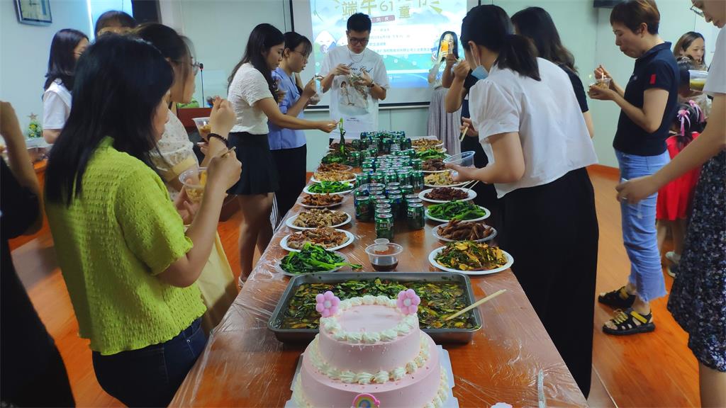 | 接着自助午餐时间,庆端午又喜遇儿童节,今天大家都特别乐,都当了一回干饭宝宝 :蛋糕、绿豆沙、叉烧、烧鹅、酱油鸡、凉拌。。。今天允许大家流口水 ,大口大口的吃,当一回不顾形象的童宝宝 |