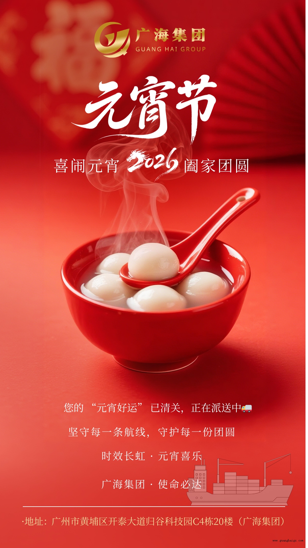 元宵佳节,月圆人圆 ——广海集团 祝您阖家安康,万事顺遂 发布时间:26-03-03 灯火映万家,团圆共此时。值此元宵佳节来临之际,广海集团向一直以来关心、支持我们的广大客户、合作伙伴及社会各界朋友,致以最诚挚的节日问候! [ 返回列表 ] 上一篇:温柔亦有力量,坚守不负芳华 ——广海集团致敬所有女性奋斗者 下一篇:开工大吉